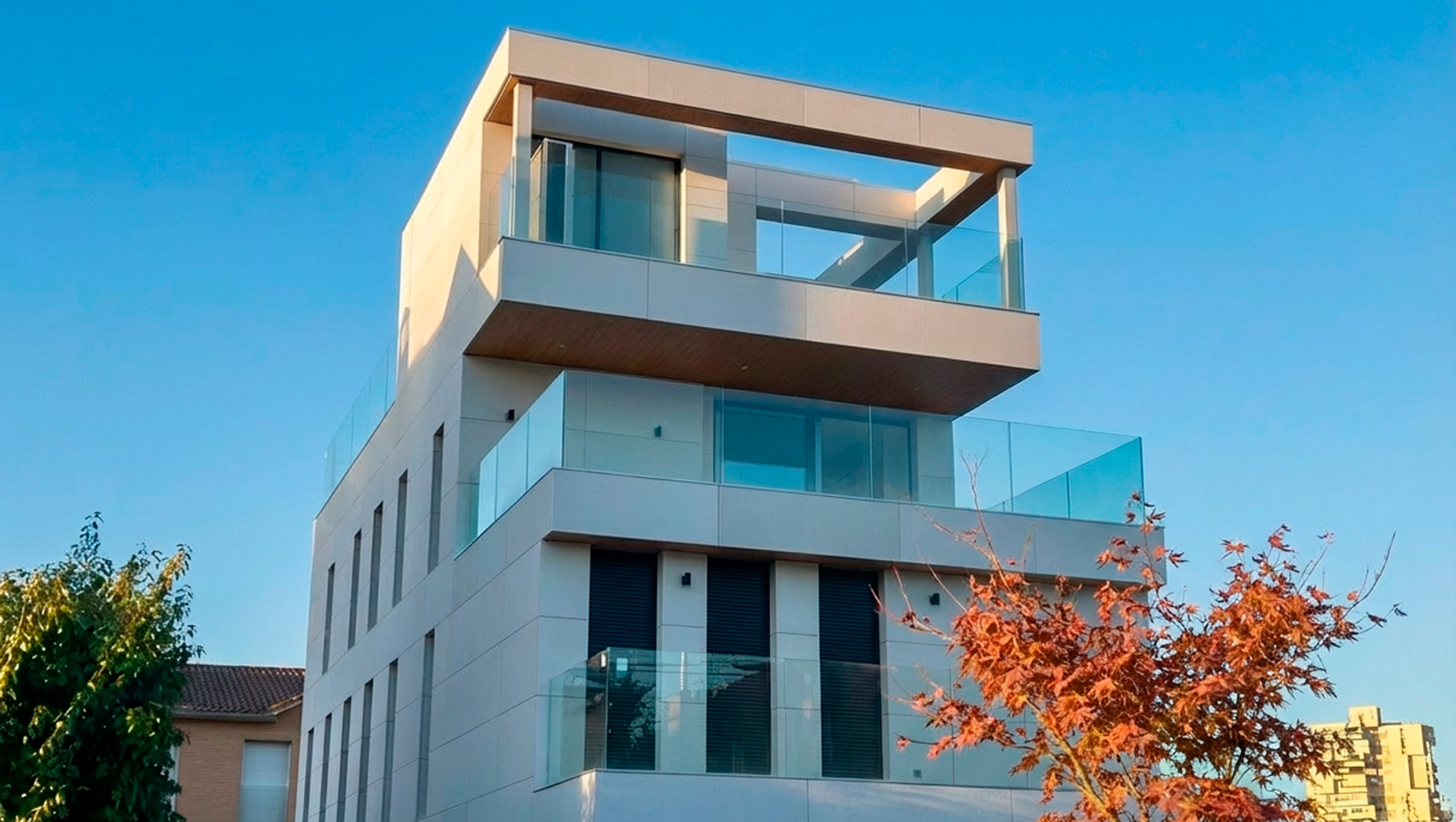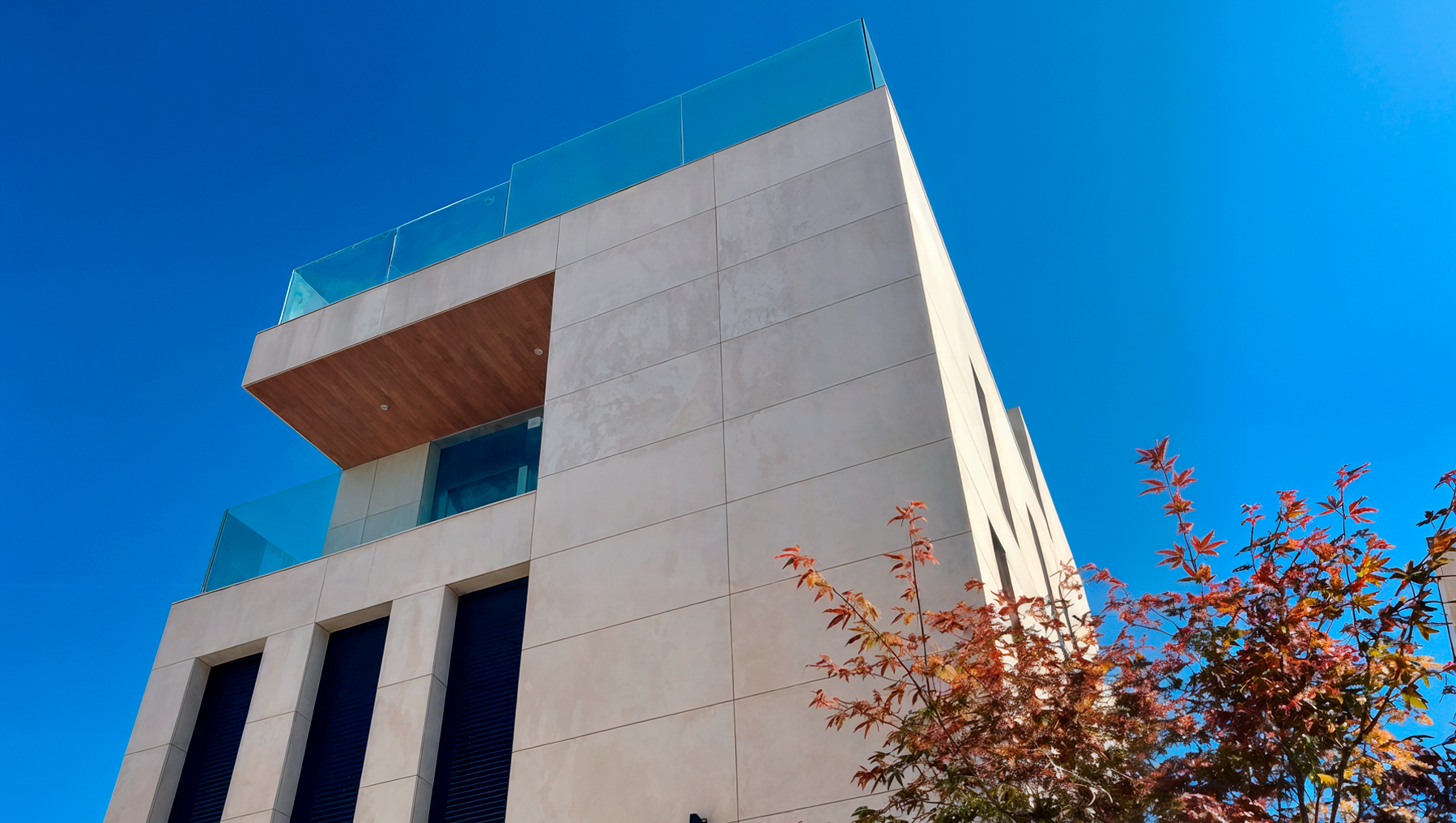 La imagen del edificio se identifica por una volumetría prismática y abstracta en la que el revestimiento de aplacado de piedra se convierte en el protagonista, remarcando el despiece los huecos verticales.
