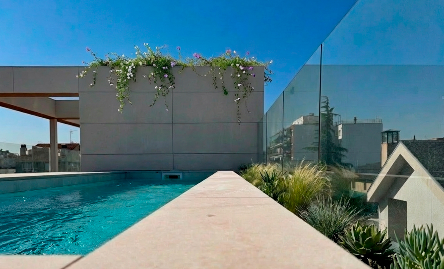 Esta vivienda unifamiliar aislada con piscina en azotea se localizada en el barrio residencial de Canillas, en la trasera de la Avenida de Arturo Soria. Se caracteriza por la baja densidad heredada del tejido original; parcelas de tamaño reducido, la homogeneidad del trazado y el carácter social del barrio. En cambio, estas características convierten el barrio en un demandado polo residencial de lujo, donde la vivienda se convierte en un oasis.